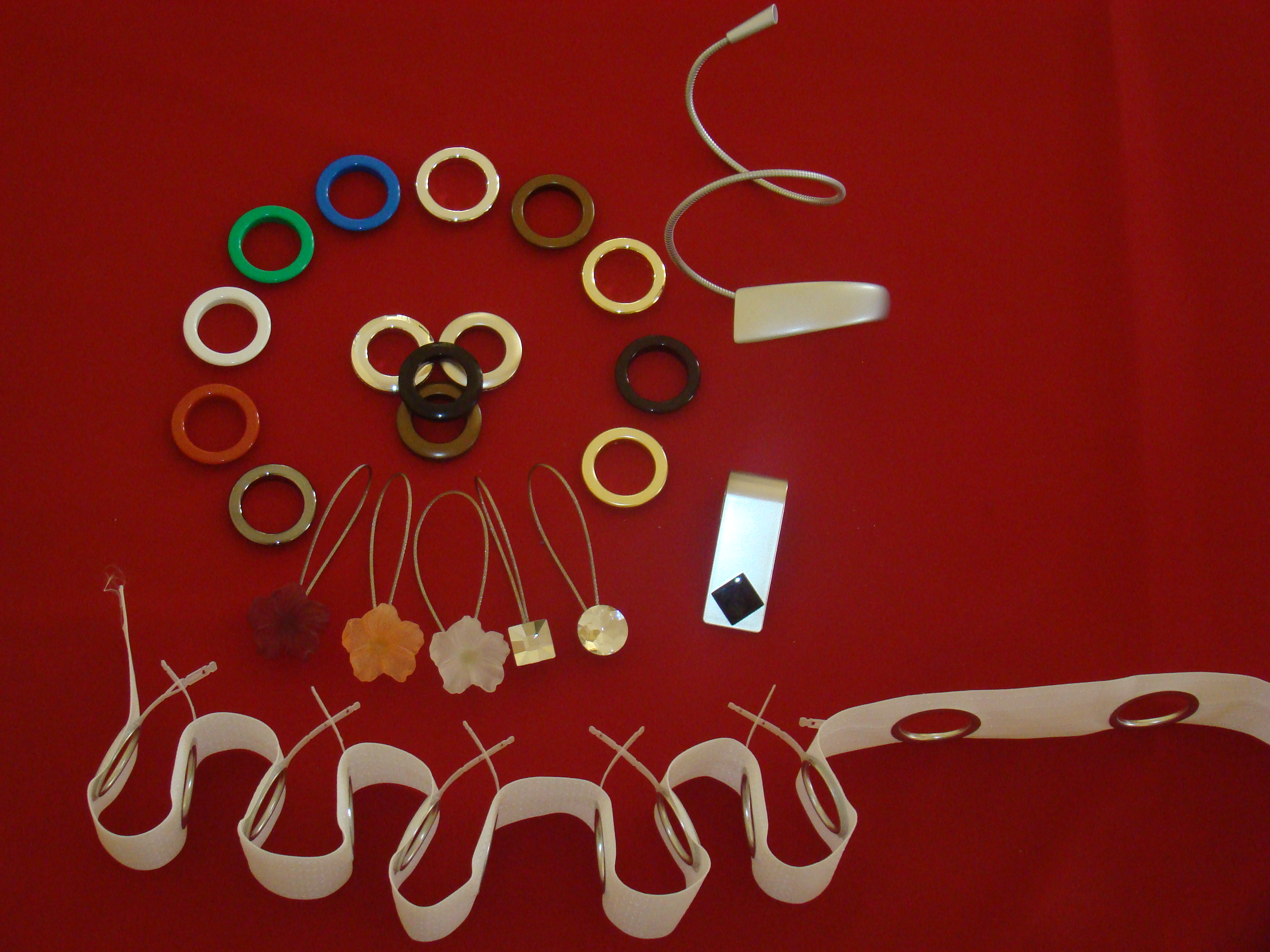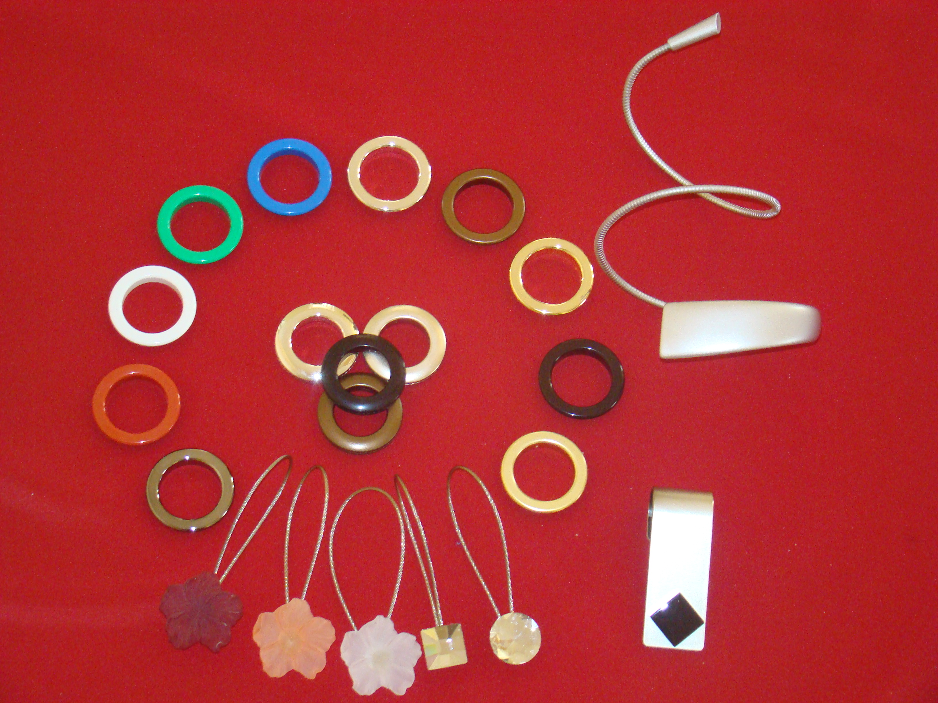 Accesoriile sunt o componenta importanta in realizarea unui asamblu de efect, de aceea acordam o mare importanta acestui segment. Acestea includ: canafi de diferite modele, marimi si culori sisteme rigide de prindere tip buton, carlig sau alta forma, sisteme de prindere reprezentate de magneti decorativi de diferite forme, marimi sau culori plus multe sisteme.